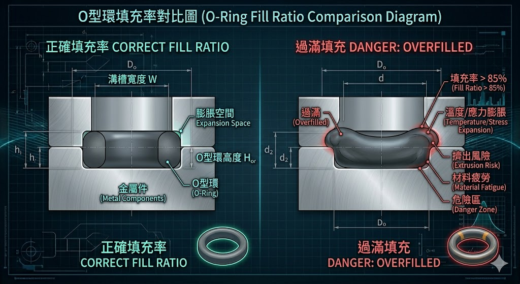 若填充率超過 85%,O 型環無處膨脹,就會在溝槽內產生巨大的額外應力,加速壓縮永久變形失效。