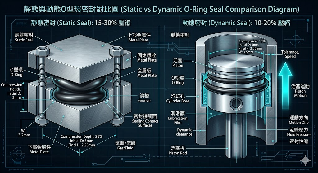 O 型環最重要的使用情境分類是「靜態」與「動態」,這直接影響材質硬度、壓縮率的選擇: