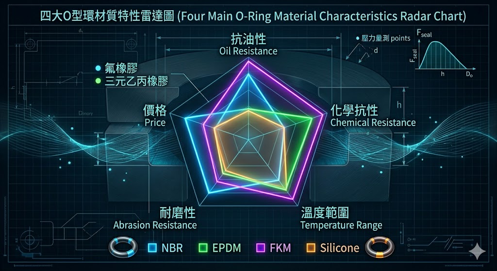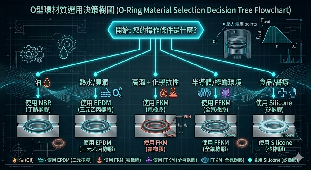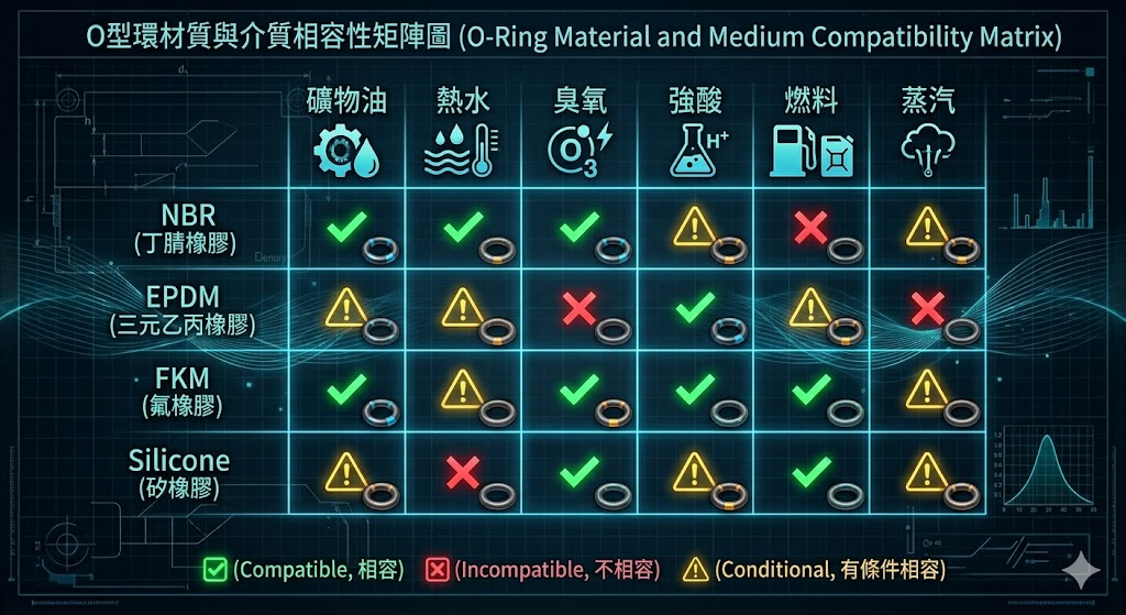 材質選錯,是 O 型環失效中最常見、也最昂貴的錯誤。以下是目前市場最主流的四種材質,附帶最關鍵的「禁用場景」說明: