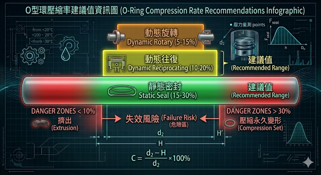 ⚠️ 壓縮率不是越高越好! 壓縮率超過 30% 時,O 型環的應力集中會大幅縮短壽命,且在高溫環境下更容易產生「壓縮永久變形(Compression Set)」,導致長期密封失效。