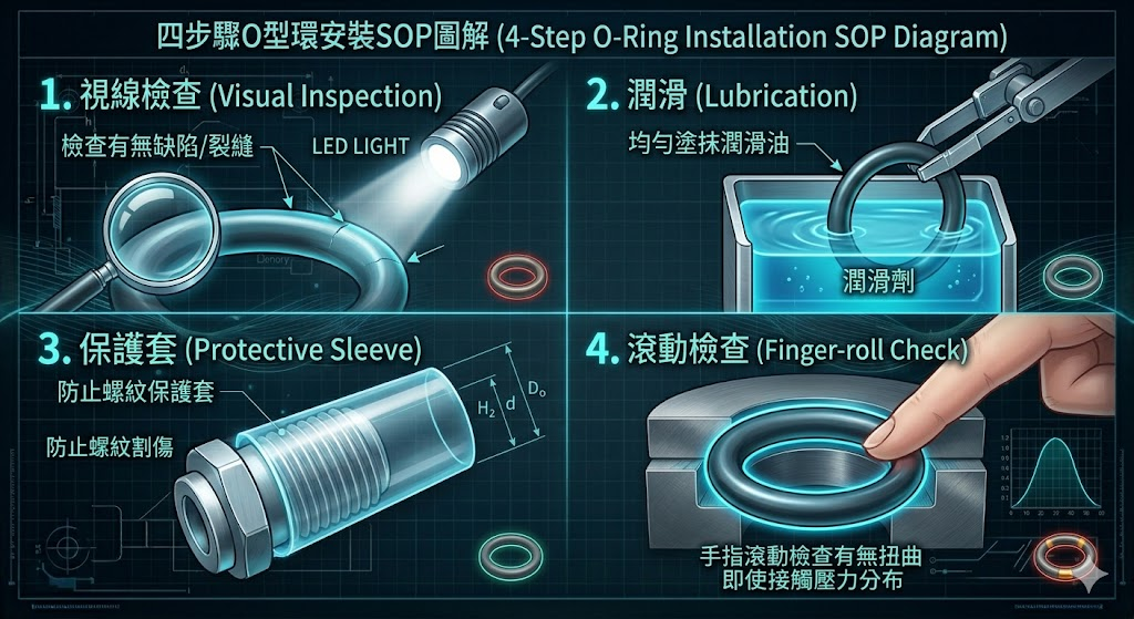 根據工安與密封件廠商的統計,安裝不當是 O 型環失效的頭號人為因素。以下四個步驟請作為廠房維修的標準操作手冊(SOP):
