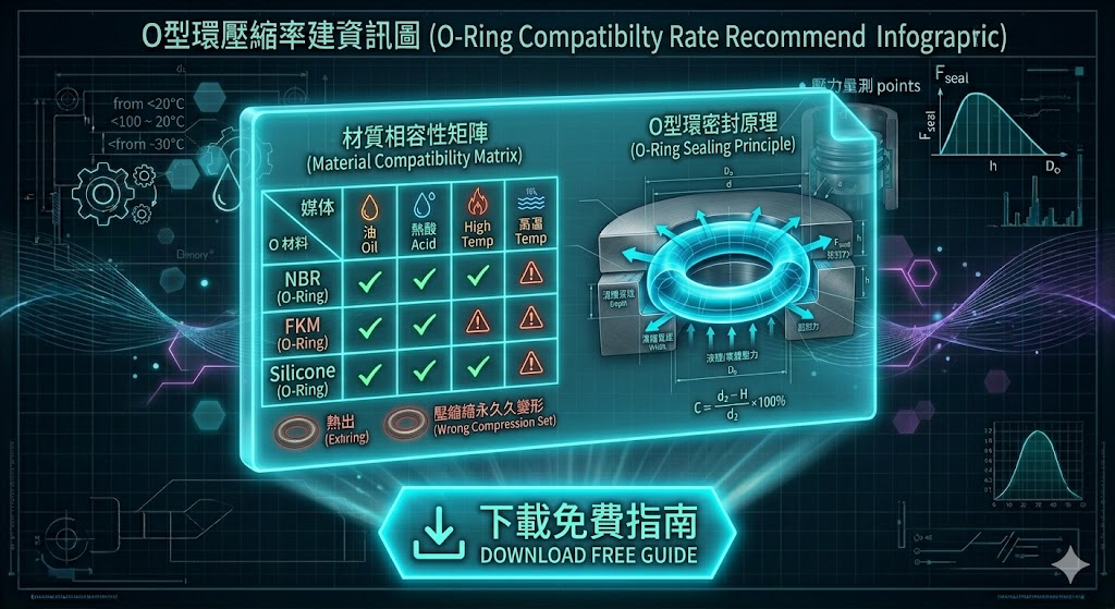 還在憑感覺選材質?我們為工程師準備了「四大材質相容性矩陣」與「壓縮率 / 溝槽深度快速計算對照表」,完全免費下載。